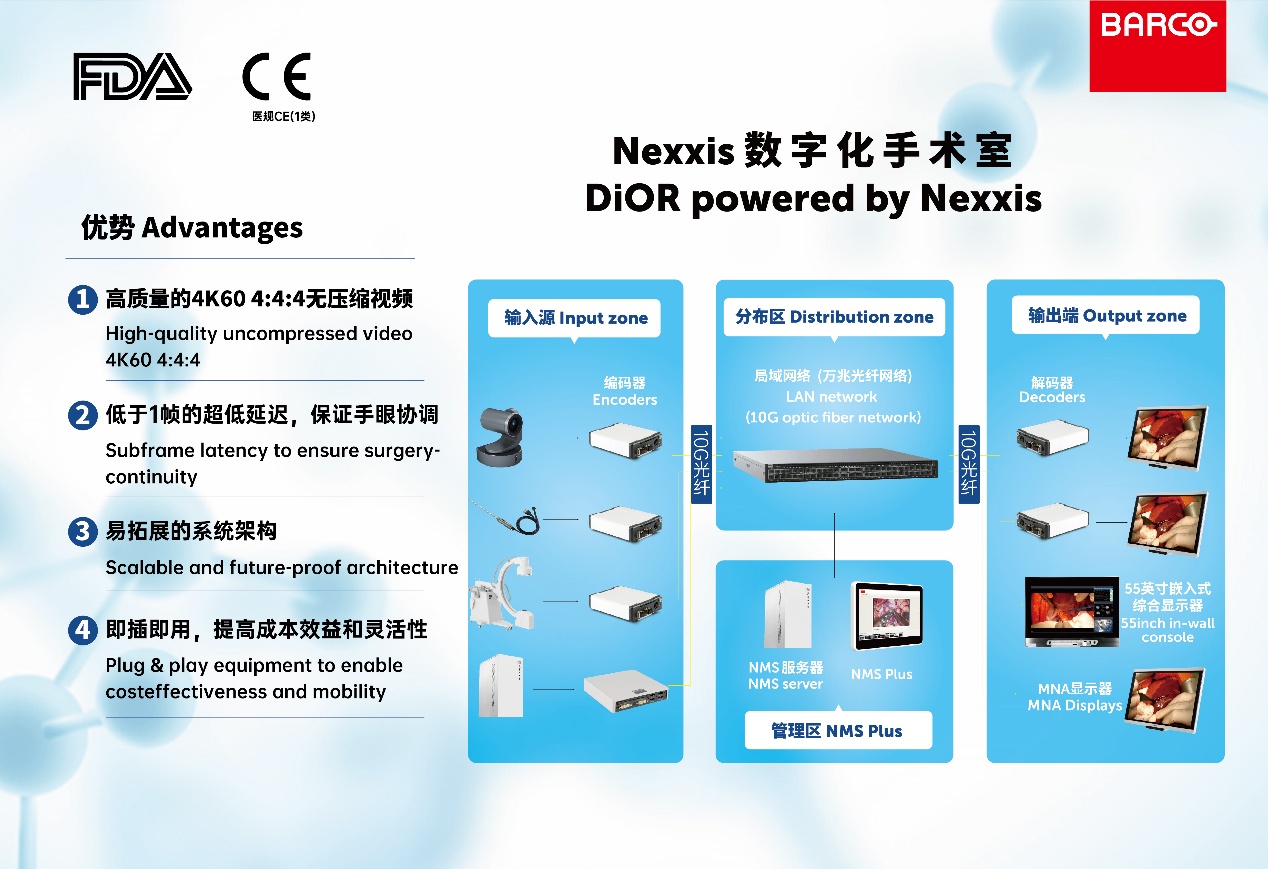 针对高度灵活的医疗场景,巴可打破了传统固定式手术室的局限,推出数字化手术室移动解决方案,大大提升手术的操作自由度。该方案通过高度集成化设计,将3D可视化、4K超高清影像和5G高速传输三大核心技术融为一体,支持实时手术操作、远程教学演示和手术直播转播等。